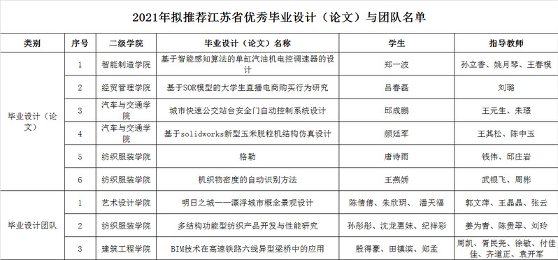经各二级学院初评推荐,学校组织专家进行评审,我校拟推荐江苏省优秀毕业论文(设计)6篇、毕业设计团队3个,现予公示,具体名单附后。公示期:2021年8月11日-8月15日,如有异议,请据实向教务处反映,电话:0515-88583916。