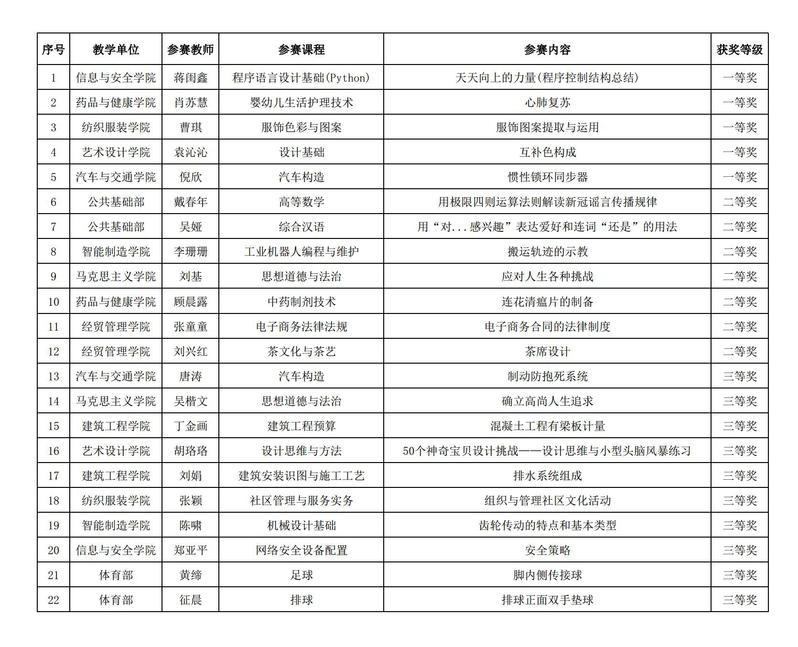 根据《关于举办2022年青年教师教学基本功比赛的通知》要求,经二级教学单位初赛选拔,教务处组织校级决赛,评出一等奖5项、二等奖7项、三等奖10项,现将比赛结果予以公示。