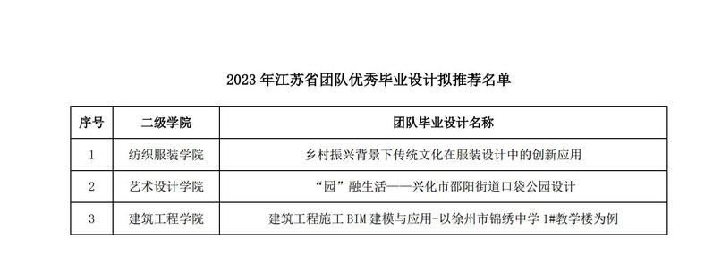 根据《省教育厅办公室关于开展2023年度本专科优秀毕业论文(设计)推荐工作的通知》(苏教办评函〔2023〕9号)的相关规定和要求,经个人申报、二级学院初评推荐、学校组织专家评审,我校拟推荐江苏省优秀毕业论文(设计)7篇、团队优秀毕业设计3个,现予以公示,具体名单附后。公示时间为2023年8月14日-8月18日,如有异议,请据实向教务处反映,联系电话:0515–88583916。