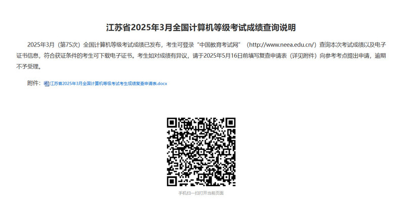 2025年3月全国计算机等级考试(NCRE)成绩已发布,考生可登录“江苏省教育考试院”(https://www.jseea.cn/webfile/index/index_zkxx/2025-05-09/7326513147336986624.html)查看成绩查询说明,对成绩有异议的考生,请在2025年5月16日前,按照省考试院提供的方式向考点提出成绩复查申请,逾期不予受理。